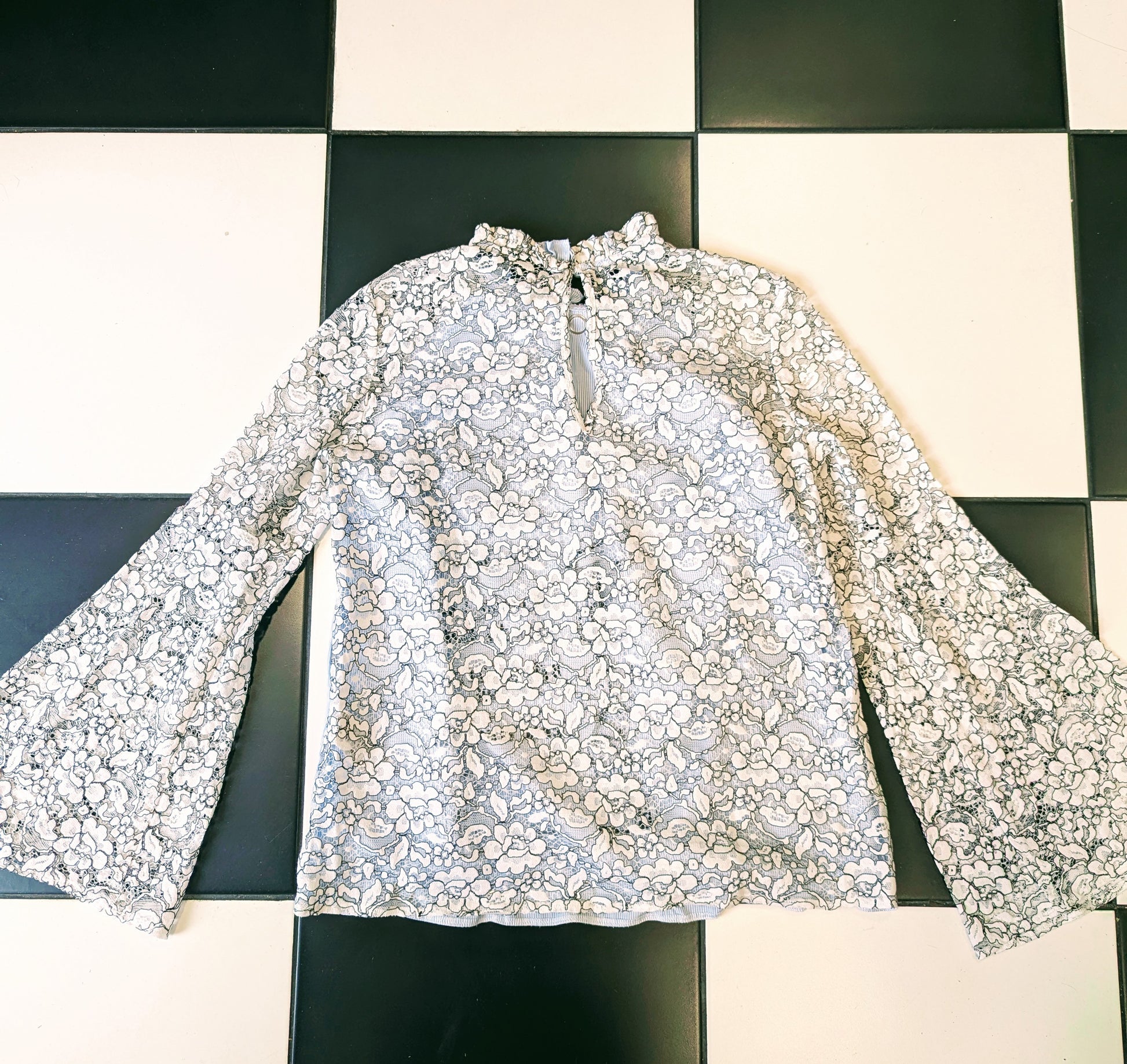 Screen printed illustrations and text with added metal eyelets. This top is old skl Topshop with a beautiful lace covered back and floaty bell sleeves with a modern edge.
