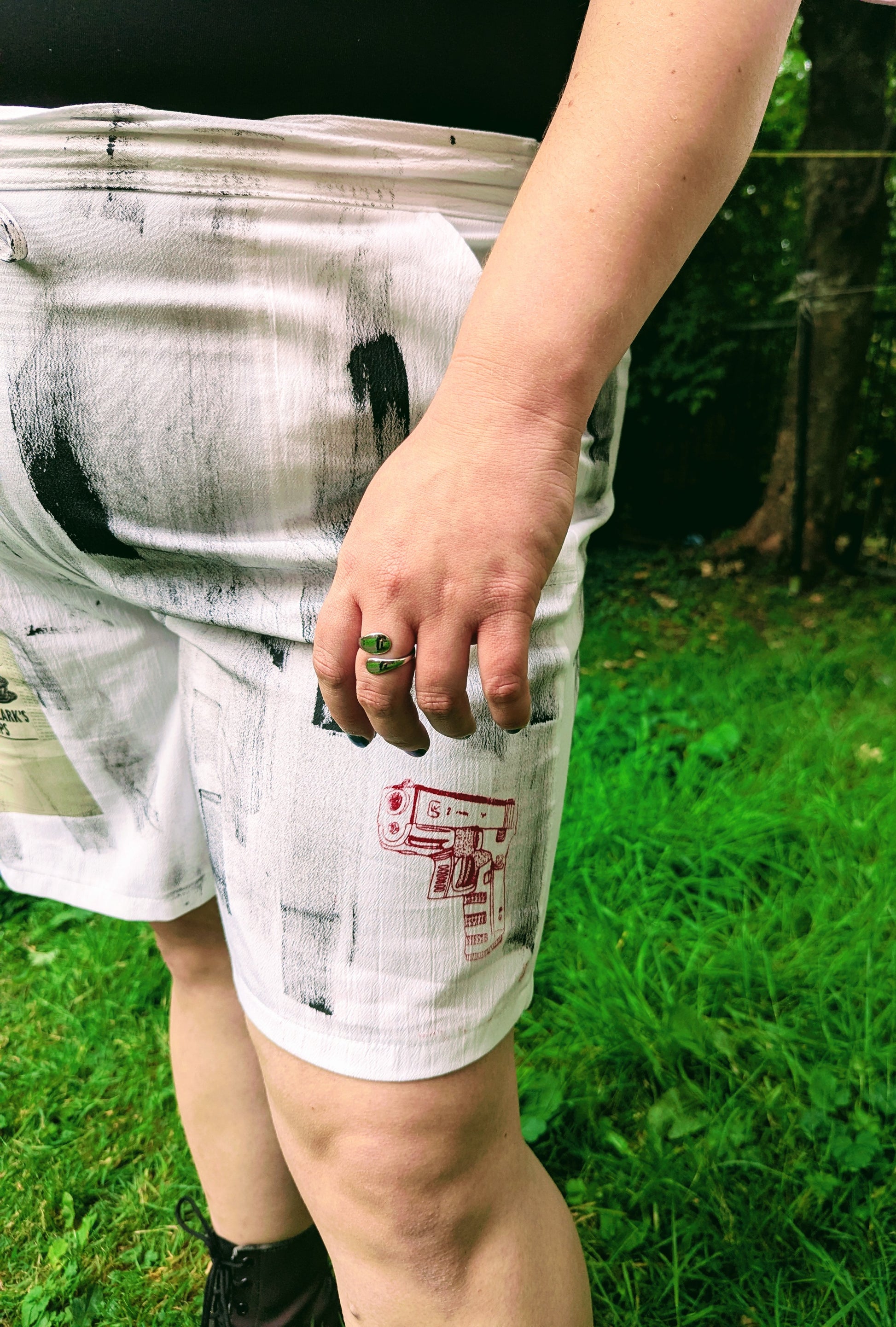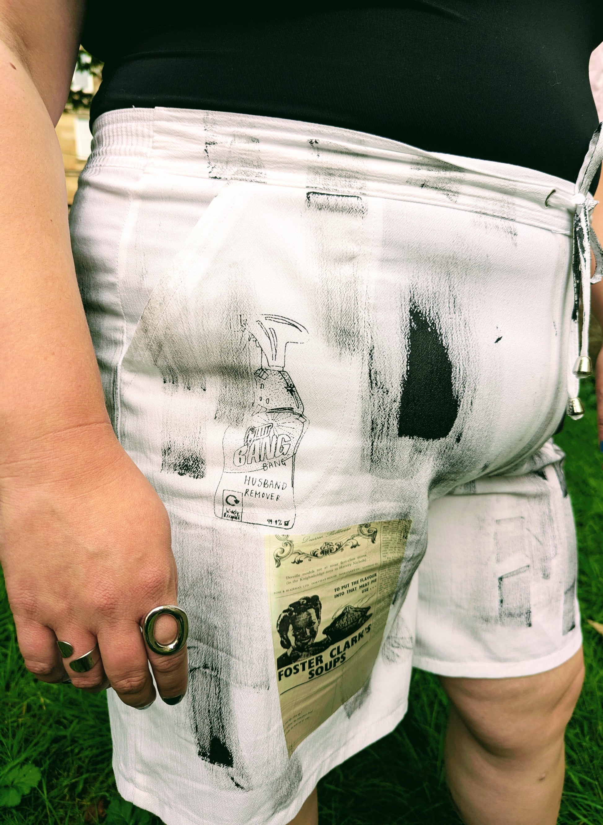 Screen printed illustrations, mixed with DTF patches and hand-painted acrylic brush strokes all over. It's giving woman finds out husband is cheating and runs over his shorts with the car tyres. Tie waist so you can adjust yourself!